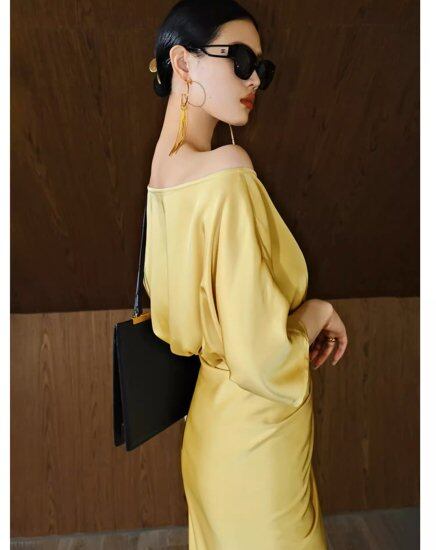 パーティードレス レディース アシンメトリー ワンショルダー ワンピース ラグランスリーブ 半袖 五分袖 光沢 ウエストマーク ドレープ 2color エレガント 結婚式 披露宴 謝恩会 おしゃれ