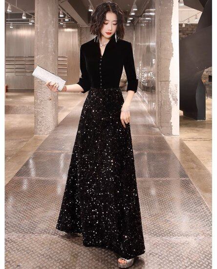 パーティードレス レディース Vネック 長袖 七分袖 ボタン スパンコール ビジュー 切り替え ワンピース キラキラ シック エレガント 華やか 結婚式 演奏会 謝恩会 イブニングドレス おしゃれ