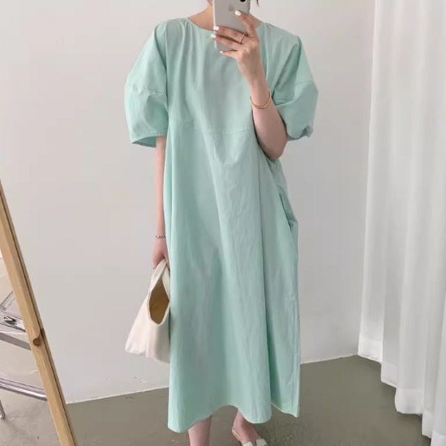 ロングワンピース レディース ワンピース 半袖ワンピース パフスリーブ ボリューム袖 ラウンドネック シンプル 無地 春夏 ゆったり カジュアル お出かけ おしゃれ きれいめ ワンサイズ ファッション