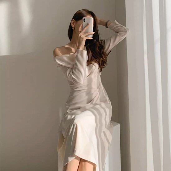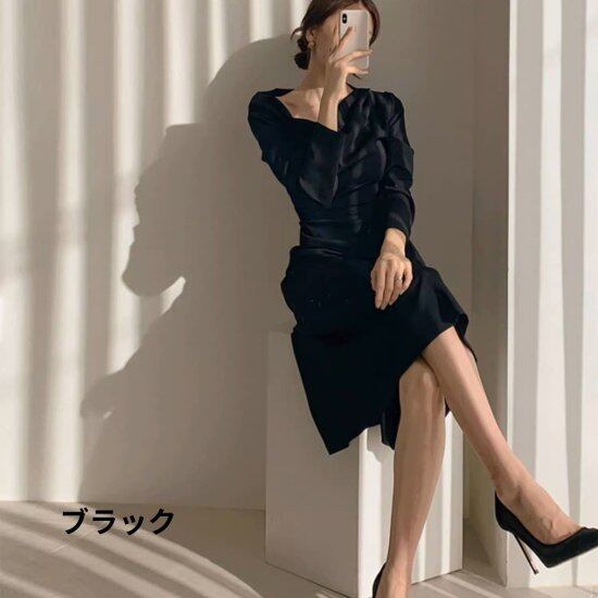 パーティードレス レディース ワンピース オフショルダー ドレープ 長袖 ワンショルダー ミモレ丈 ロング丈 Aライン 2color きれいめ エレガント 結婚式 披露宴 謝恩会 二次会 おしゃれ