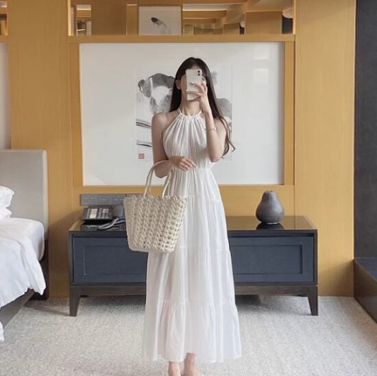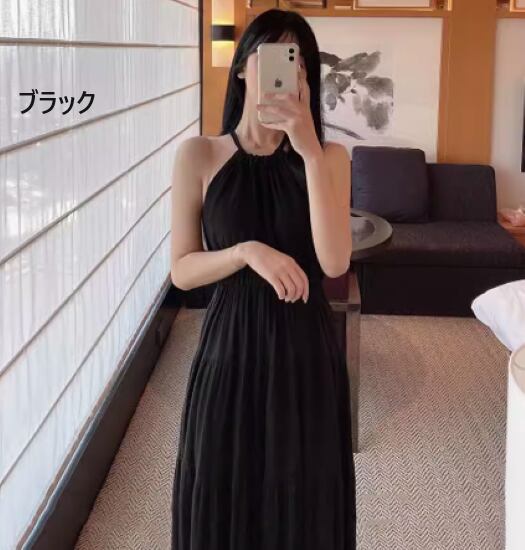 ロングワンピース レディース ワンピース リゾートワンピース ホルターネック シフォンワンピース ロング丈 春夏 カジュアル お出かけ おしゃれ バカンス ギャザー ホワイト ブラック きれいめ