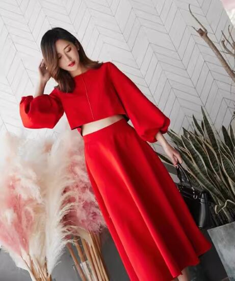 セットアップ レディース 2点セット 上下セット ツーピース トップス ショート丈 クロップド丈 ボリューム袖 ラウンドネック ボトムス スカート ハイウエスト シンプル 無地 カジュアル お出かけ