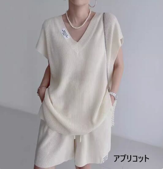 ニットセットアップ レディース 2点セット 上下セット ツーピース トップス 半袖 Vネック ボトムス ショートパンツ ショーツ シンプル 無地 カジュアル お出かけ おしゃれ ゆったり ルームウェア