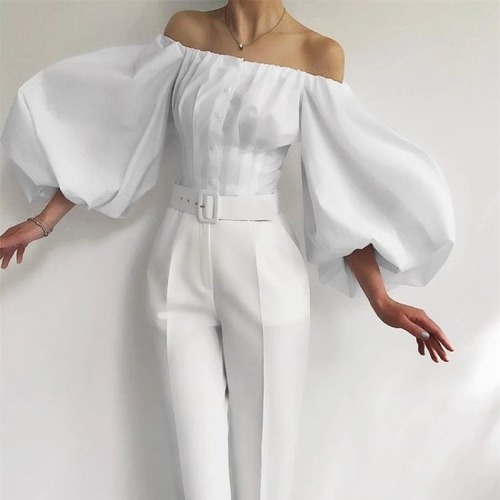 ブラウス レディース オフショルダー ランタンスリーブ ボリューム袖 パフスリーブ 個性的 ユニーク 肩出し フレンチ シャツ プルオーバー モード エレガント きれいめ パーティー おしゃれ