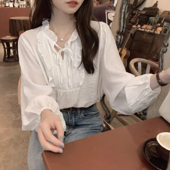 ブラウス レディース フリル Vネック ラウンドネック シャツ プルオーバー リボン 長袖 パフスリーブ ランタンスリーブ ゆったり レトロ クラシカル フェミニン ナチュラル ガーリー おしゃれ