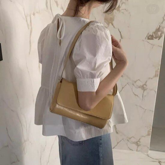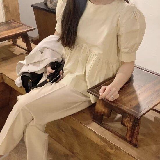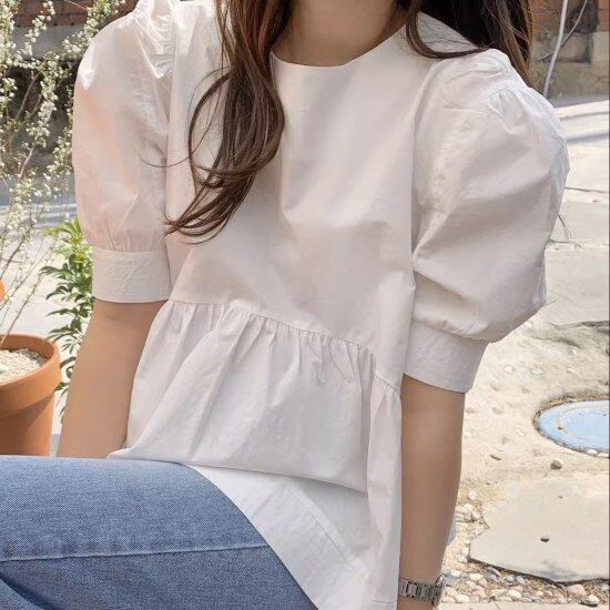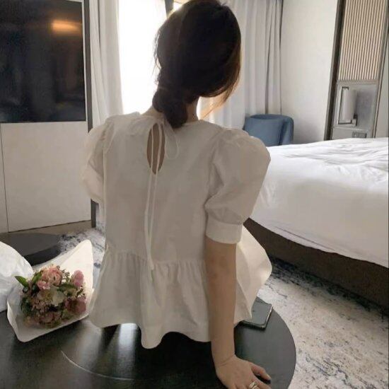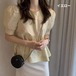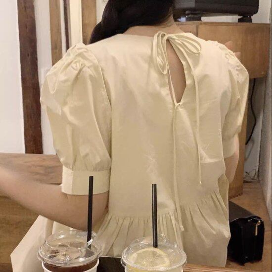 ブラウス レディース パフスリーブ 半袖 切り替え ラウンドネック ボリューム袖 バックリボン シャツ ふんわり レトロ 2color フェミニン かわいい カジュアル ナチュラル デート おしゃれ