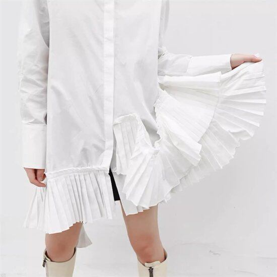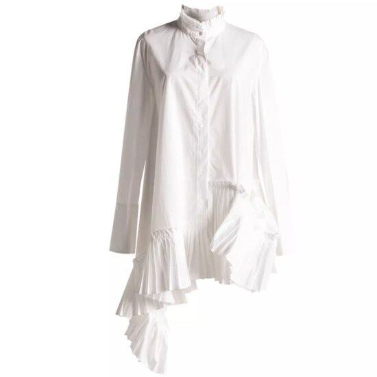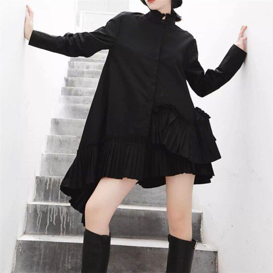 シャツワンピース レディース アシンメトリー ミニワンピース フリル プリーツ 長袖 スタンドカラー ハイネック カフス シャツ 個性的 ユニーク モード ガーリー レトロ 2color おしゃれ