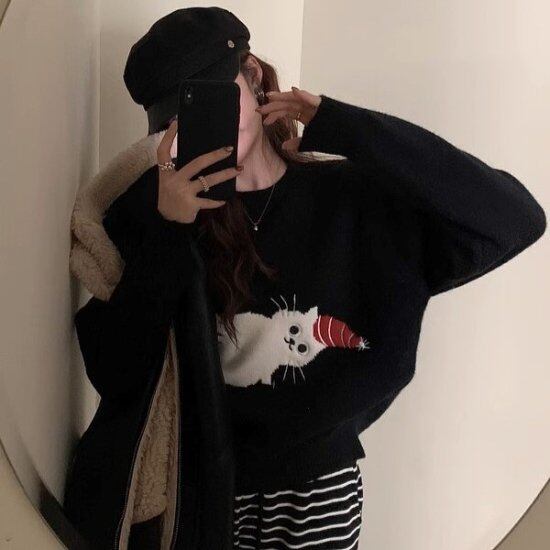 ニットセーター レディース ねこ 長袖 ラウンドネック クルーネック ニット 猫 ネコ cat アニマル ショート丈 かわいい ガーリー cute カジュアル クリスマス 3color おしゃれ