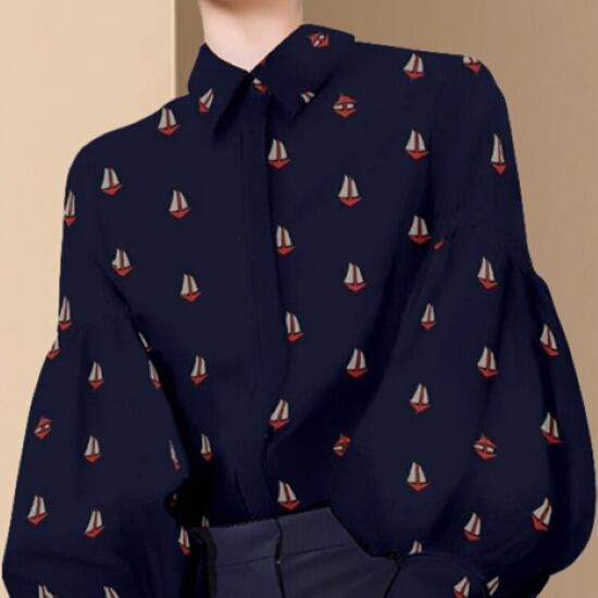 シフォンブラウス レディース トップス シフォンシャツ 長袖ブラウス 長袖シャツ ボリューム袖 ランタンスリーブ 総柄 プリント ヨット柄 襟あり ポロ襟 カジュアル お出かけ おしゃれ ファッション