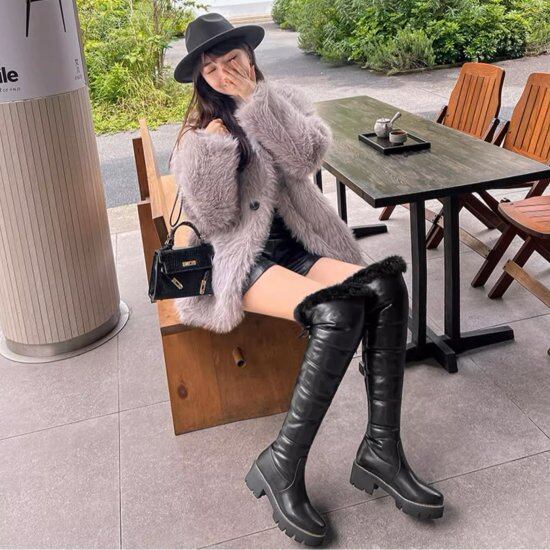 ロングブーツ レディース ニーハイブーツ ファー ダウン ラウンドトゥ フェイクファー キルティング 厚底 ハイヒール 5.5cmヒール 2color 脚長 美脚 きれいめ カジュアル おしゃれ