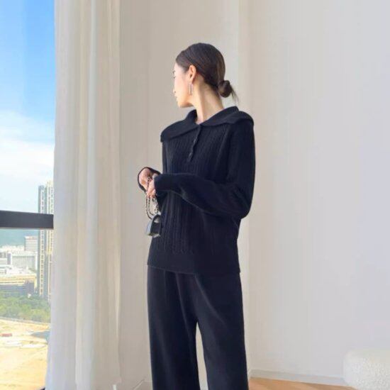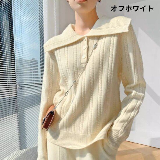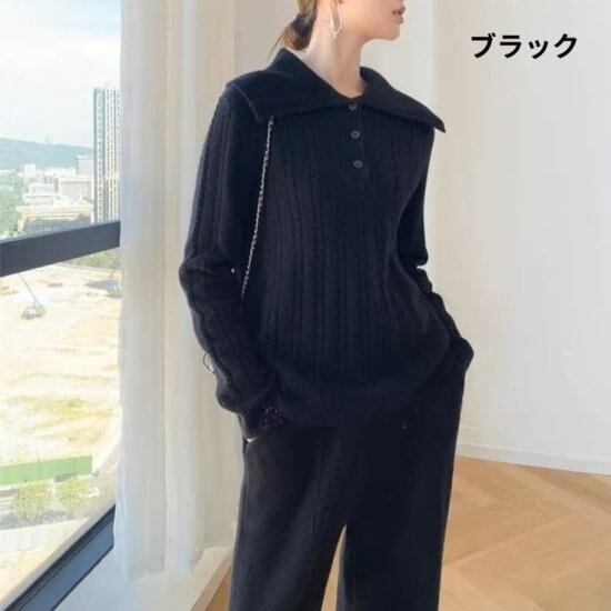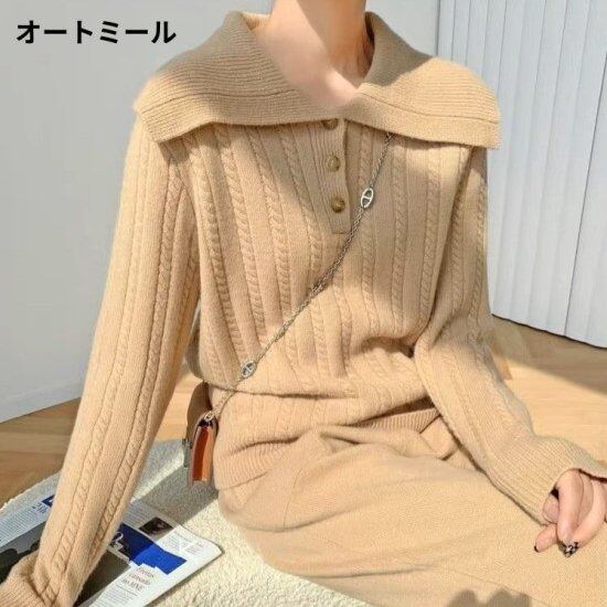 セットアップ レディース ニットスーツ 上下セット セーター プルオーバー ケーブル編み ビックカラー ニットパンツ ワイドパンツ ロング 3color ニットアップ カジュアル きれいめ おしゃれ