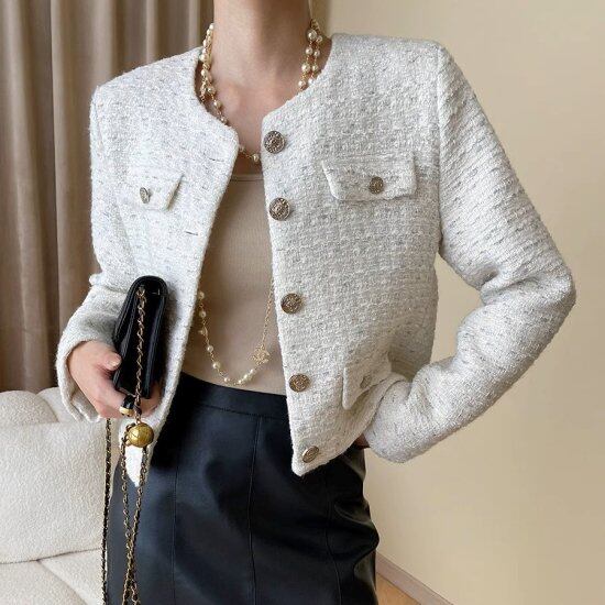 ツイードジャケット レディース ノーカラー 長袖 ボタン ラウンドネック シングルブレスト ショート丈 クロップド丈 きれいめ エレガント 結婚式 披露宴 入学式 卒業式 セレモニー おしゃれ