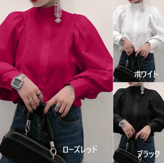 長袖シャツ レディース トップス 長袖ブラウス フロントボタン スタンドカラー 無地 ボリューム袖 ランタンスリーブ カジュアル お出かけ おしゃれ きれいめ エレガント オフィス パフスリーブ