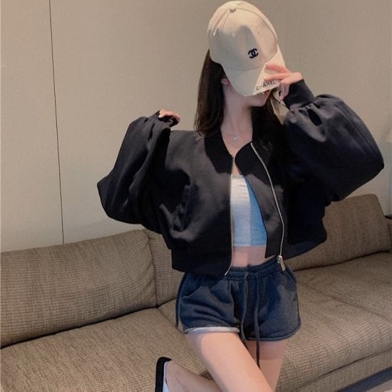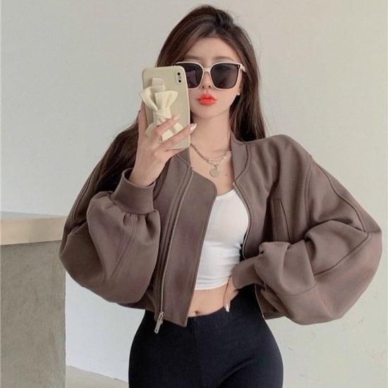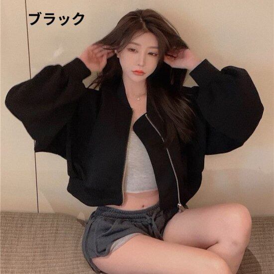 ショートジャケット レディース ブルゾン スウェット 長袖 パフスリーブ ランタンスリーブ ボリューム袖 ショート クロップド ファスナー 2color レトロ カジュアル スポーティー おしゃれ