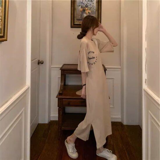 Tシャツワンピース レディース ロングワンピース バックオープン ロゴ 半袖 ラウンドネック 背中あき Aライン ロング丈 ミモレ丈 カジュアル ガーリー スポーティー ワンピース おしゃれ