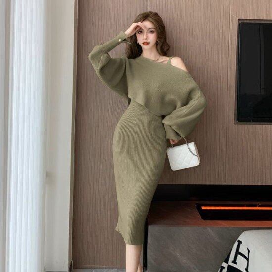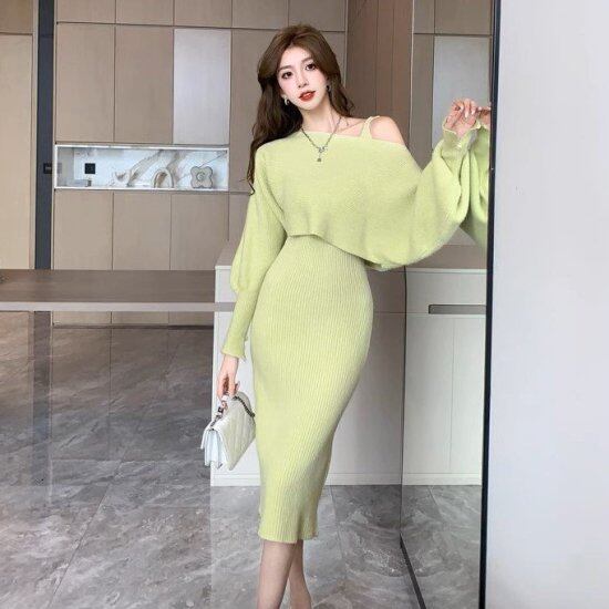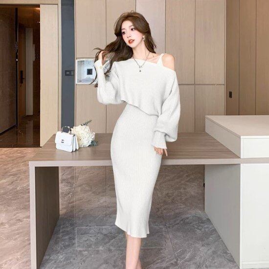 セットアップ レディース ニット セーター 長袖 プルオーバー ボリューム袖 ショート丈 クロップド丈 ニットワンピース スリム タイトワンピース リブニット きれいめ エレガント おしゃれ