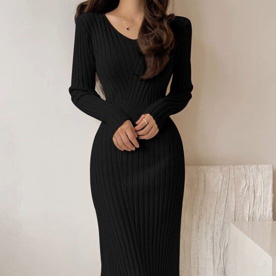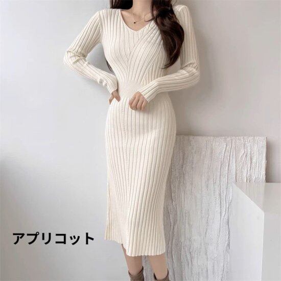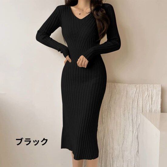 ニットワンピース レディース Vネック リブニット 長袖 タイトワンピース ミモレ丈 ロング丈 スリム レトロ シック モード 3color きれいめ エレガント セクシー オフィス おしゃれ