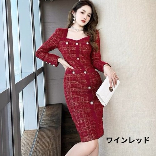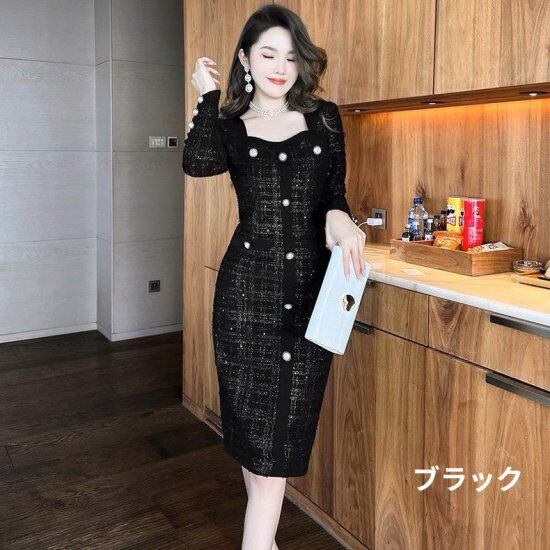 ツイードワンピース レディース チェック柄 長袖 タイトワンピース スクエアネック ボタン ひざ丈 ミモレ丈 レトロ クラシカル 2color セレモニー 入学式 卒業式 入園式 卒園式 おしゃれ