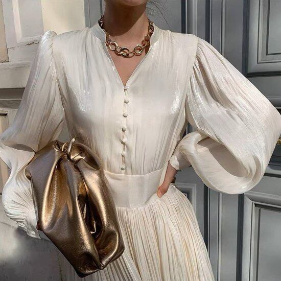 ロングワンピース レディース プリーツワンピース 長袖 ボリューム袖 サテン調 光沢 Vネック 上品 きれいめ エレガント レトロ クラシカル 3color 入学式 卒業式 入園式 卒園式 おしゃれ
