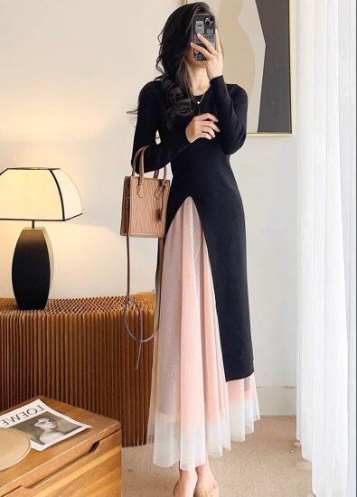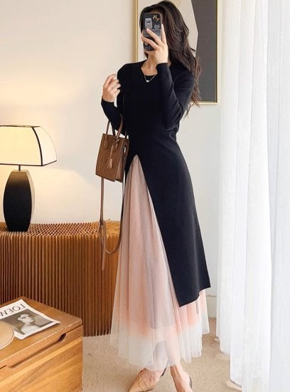 セットアップ レディース ニット ワンピース ロングセーター 長袖 ラウンドネック スリット レイヤード チュールレース ロングスカート レーススカート 上下セット エレガント きれいめ おしゃれ