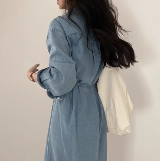 デニムワンピース レディース ワンピース シャツワンピース ミドル丈ワンピース 長袖ワンピース フロントボタン 襟あり ポロ襟 シンプル 無地 カジュアル お出かけ おしゃれ ベーシック 定番 女性