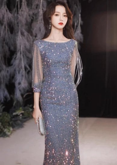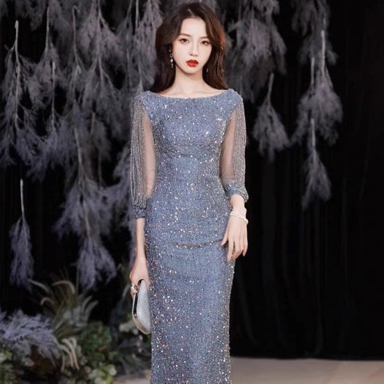演奏会ドレス レディース パーティードレス シアースリーブ 長袖 七分袖 ボートネック ビジュー スパンコール マーメイド キラキラ エレガント 華やか 結婚式 謝恩会 パーティー ドレス おしゃれ