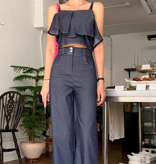 デニムセットアップ レディース 上下セット 2点セット ツーピース トップス キャミソール フリル クロップド丈 ボトムス ワイドパンツ 長ズボン ハイウエスト カジュアル お出かけ おしゃれ 春夏