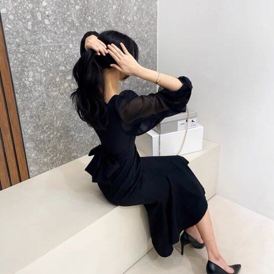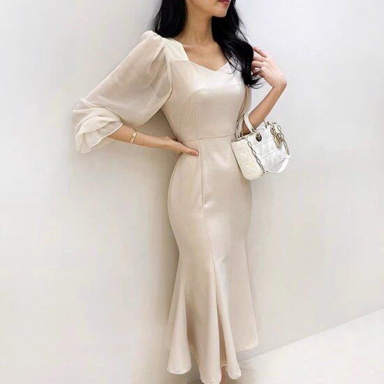 パーティードレス レディース ワンピース スクエアネック 長袖 スリット ロング丈 マキシ丈 スリム タイトワンピース レトロ クラシカル 2color 結婚式 演奏会 謝恩会 二次会 おしゃれ