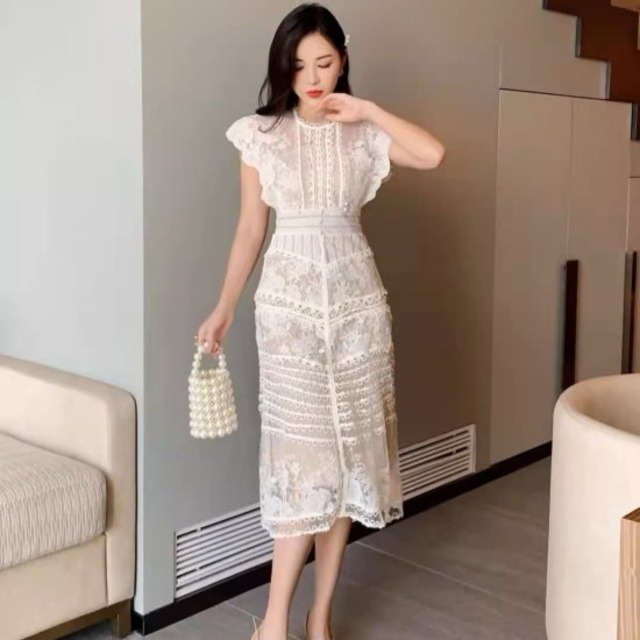 パーティードレス レディース レースワンピース 花柄レース フレンチスリーブ ラウンドネック シースルー シアー Aライン レトロ クラシカル 華やか 2color 結婚式 披露宴 謝恩会 おしゃれ