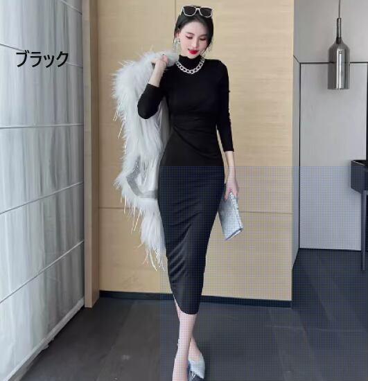 ミドル丈ワンピース レディース ワンピース 長袖 スリムフィット タイトワンピース ハイネック シンプル 無地 カジュアル お出かけ おしゃれ きれいめ スタイリッシュ エレガント フォーマル 女性