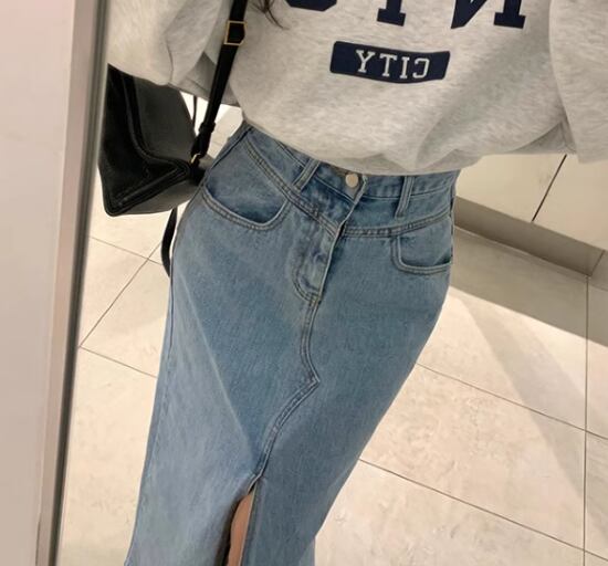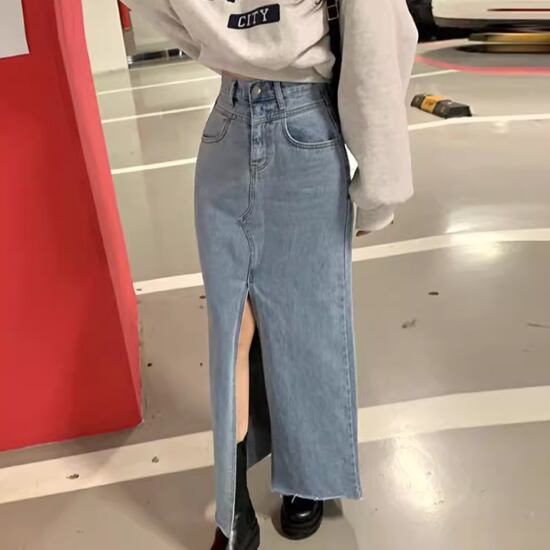 ロングスカート レディース ボトムス スカート デニムスカート フロントスリット スリムフィット ポケット ハイウエスト カジュアル お出かけ おしゃれ ロング丈 ファッション 女性 セクシー ブルー