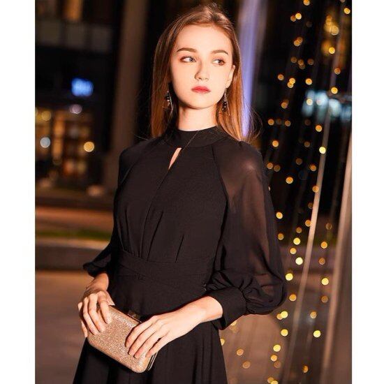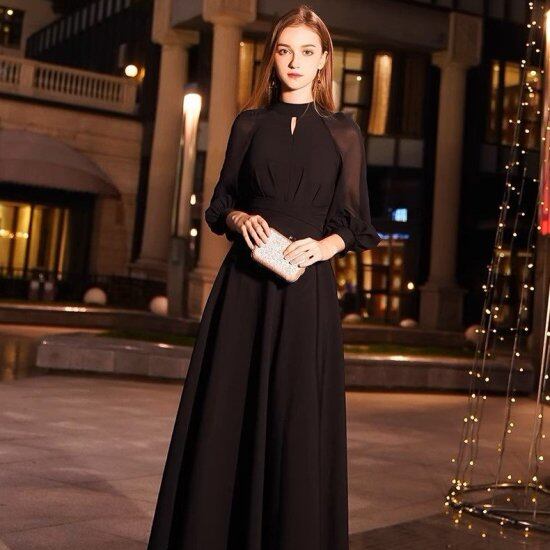 パーティードレス レディース Aライン 長袖 パフスリーブ ランタンスリーブ ハイネック スタンドカラー ホルターネック ロング マキシ 3color エレガント 結婚式 演奏会 謝恩会 おしゃれ