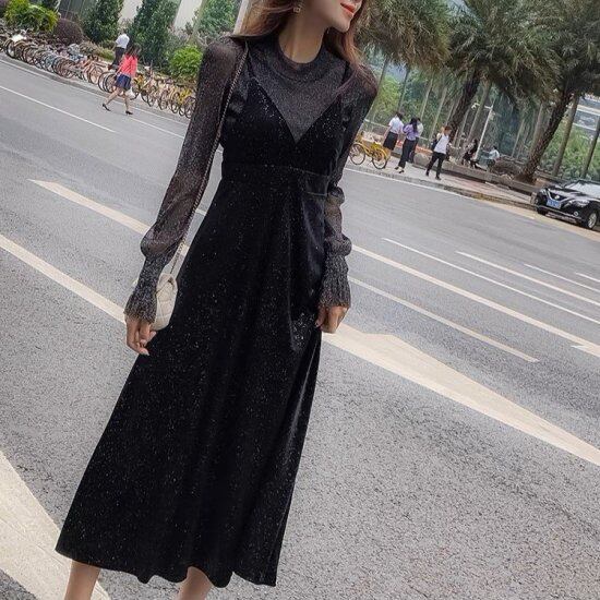 パーティードレス レディース セットアップ 長袖 ベルベット キャミソールワンピース Vネック プルオーバー ハイネック キラキラ エレガント かわいい 結婚式 謝恩会 二次会 パーティー おしゃれ