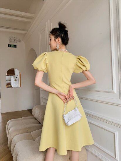 パーティードレス レディース パフスリーブ ワンピース Vネック 半袖 ボリューム袖 Aライン ひざ丈 ミモレ丈 イエロー クラシカル レトロ エレガント 結婚式 演奏会 披露宴 謝恩会 おしゃれ