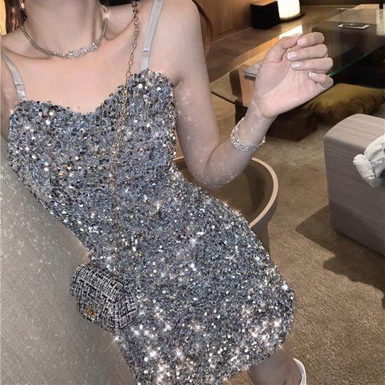 パーティードレス レディース スパンコール ミニワンピース ノースリーブ キャミワンピ タイト ミニ ショート キャミソール キラキラ グリッター 華やか かわいい ガーリー パーティー おしゃれ