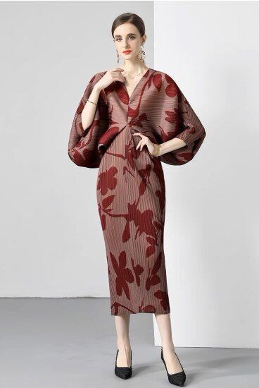 ロングワンピース レディース プリーツ 花柄 Vネック 五分袖 ボリューム袖 ドルマンスリーブ タイト ボタニカル フラワー ロング マキシ 4color 個性的 エレガント パーティー おしゃれ