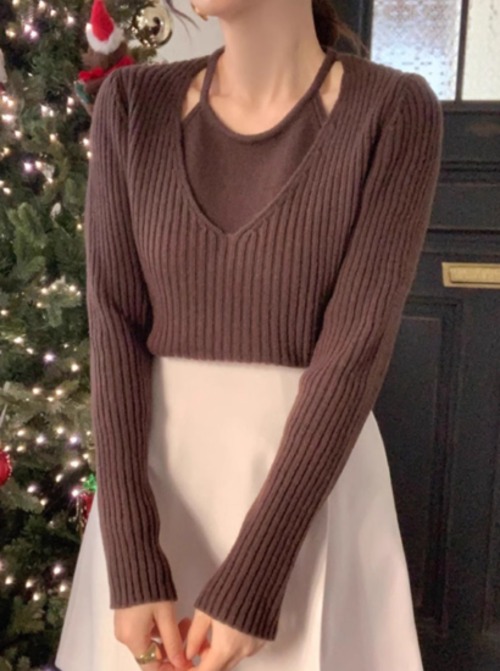 ニットセーター レディース トップス ニット セーター カットソー 長袖 リブニット ホルターネック フェイクツーピース 重ね着風 スリム カジュアル お出かけ おしゃれ きれいめ シンプル 無地
