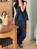 デニムセットアップ レディース 上下セット 2点セット ツーピース トップス キャミソール ぺプラム ボトムス ロングパンツ ワイドパンツ カジュアル お出かけ おしゃれ 春夏 シンプル 無地 女性