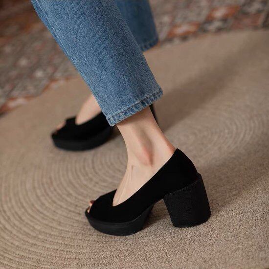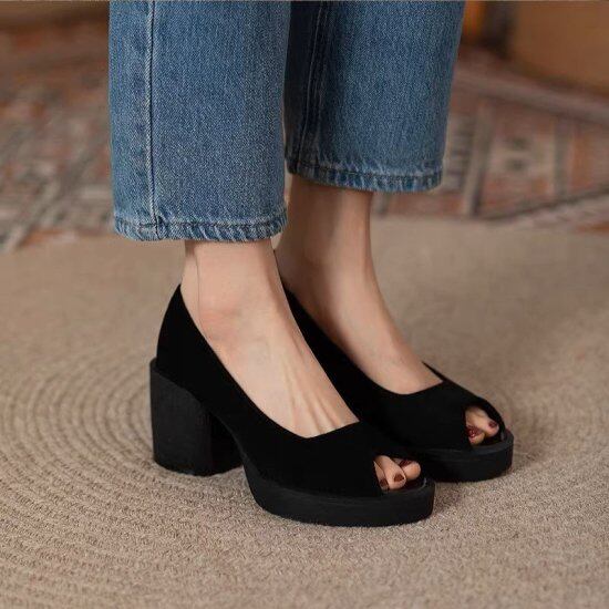 パンプス レディース オープントゥ 厚底 プラットフォーム ウェッジソール 太ヒール ハイヒール 6cmヒール スエード レトロ きれいめ エレガント カジュアル 美脚 脚長 オフィス おしゃれ