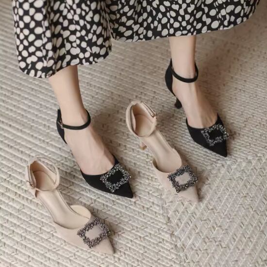 ストラップパンプス レディース ビジュー バックル ポインテッドトゥ ハイヒール 選べるヒール高 5cmヒール 7cmヒール アンクルストラップ エレガント 2color パーティー おしゃれ
