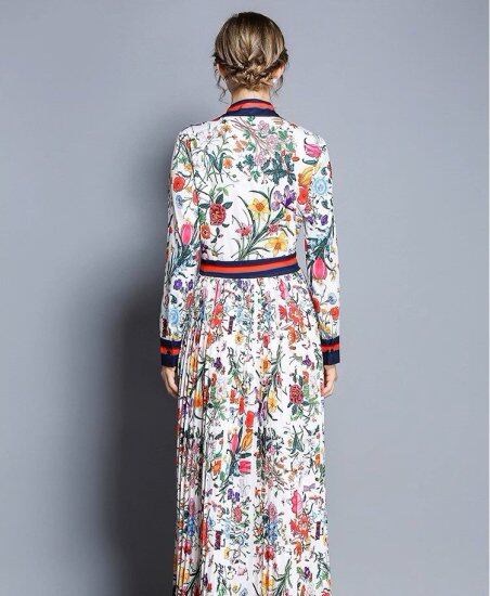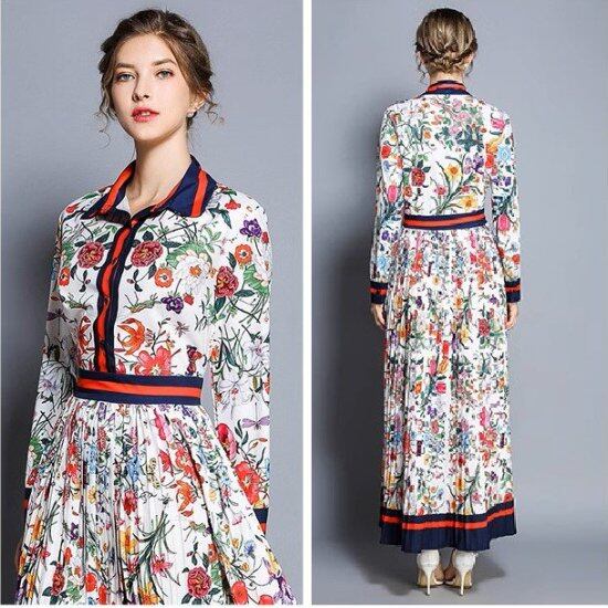 ロングワンピース レディース 花柄 長袖 Aライン プリントワンピース 花柄ワンピース ロング マキシ ポロ襟 シャツカラー レトロ クラシカル フレア きれいめ エレガント おでかけ おしゃれ