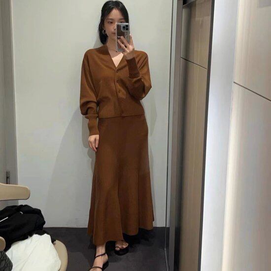 セットアップ レディース ニット Vネック カーディガン 長袖 フロントボタン ニットスカート ロングスカート フレア レトロ クラシカル 2color きれいめ 上品 カジュアル 上下 おしゃれ