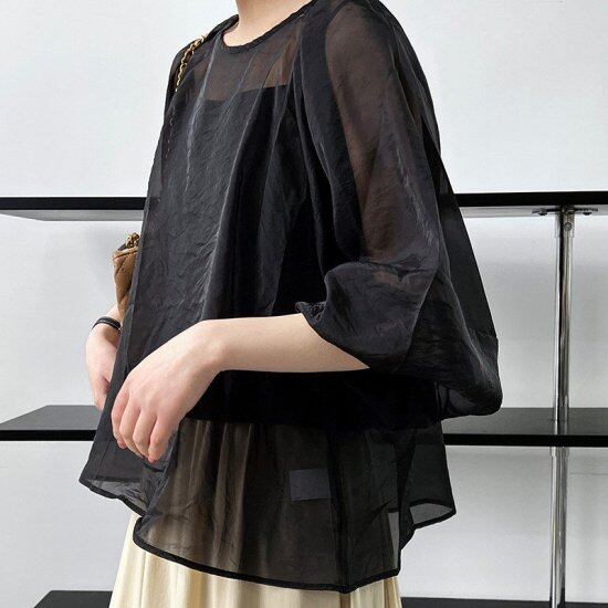 シアーブラウス レディース 長袖ブラウス シアーシャツ ランタンスリーブ ラウンドネック プルオーバー シースルー ボリューム袖 2color レトロ クラシカル きれいめ カジュアル おしゃれ