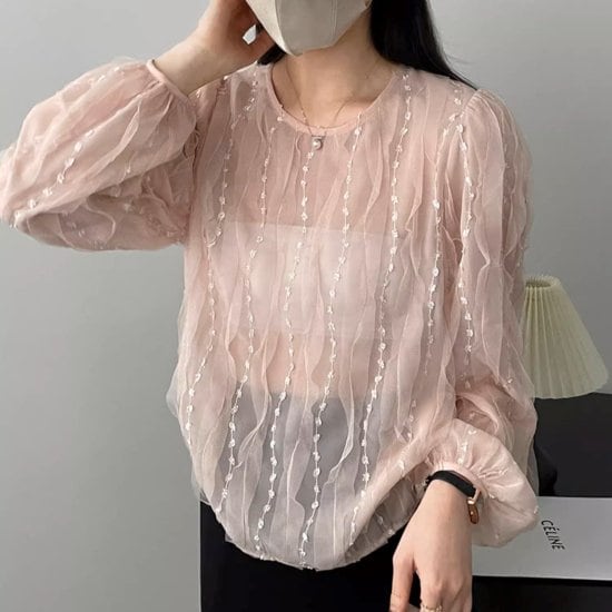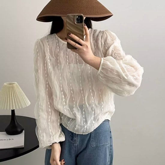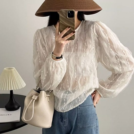 レースブラウス レディース シアーブラウス 長袖 シャツ ランタンスリーブ ラウンドネック チュール シアー シースルー レトロ クラシカル 2color かわいい きれいめ エレガント おしゃれ
