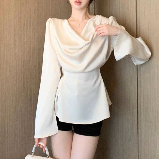 長袖ブラウス レディース プルオーバー ドレープネック スリット ボリューム袖 バックリボン サテン調 Vネック パール シャツ レトロ クラシカル エレガント きれいめ パーティー おしゃれ