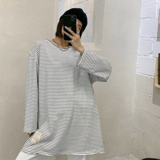 ボーダーTシャツ レディース ロングTシャツ カットソー 長袖 プルオーバー ラウンドネック ラグランスリーブ ルーズ オーバーサイズ レトロ 3color ボーダー ロング丈 カジュアル おしゃれ