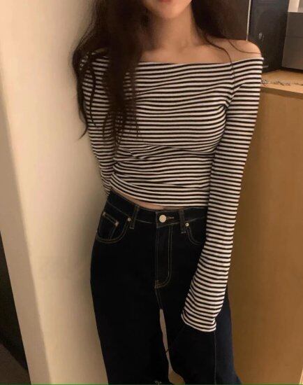 ボーダーTシャツ レディース オフショルダー カットソー Tシャツ 長袖 スリム タイト モノトーン ボーダー 肩出し デイリー セクシー カジュアル きれいめ フェミニン 大人かわいい おしゃれ