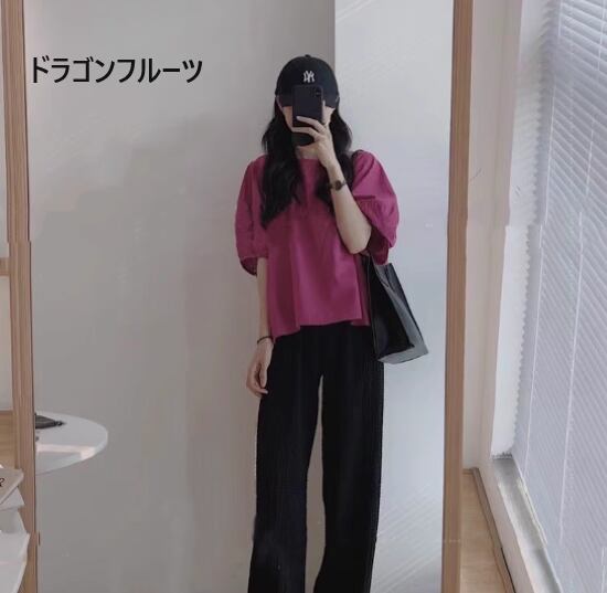 半袖ブラウス レディース トップス シャツ チュニック 五分袖 ラウンドネック プルオーバー ボリューム袖 パフスリーブ シンプル 無地 ゆったり カジュアル お出かけ おしゃれ 体型カバー 女性
