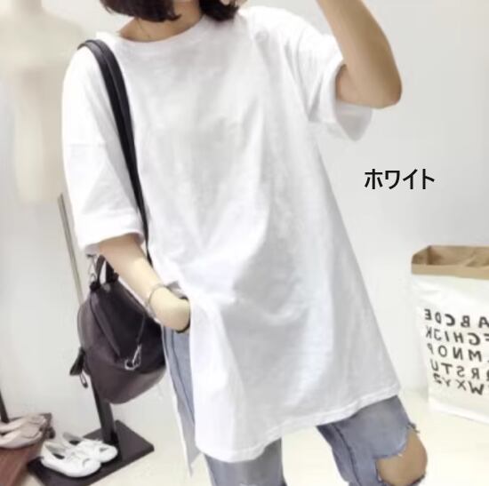 半袖Tシャツ レディース トップス ミドル丈 ラウンドネック チュニック 五分袖 プルオーバー スリット シンプル 無地 ベーシック 定番 カジュアル お出かけ おしゃれ 春夏 ゆったり 体型カバー