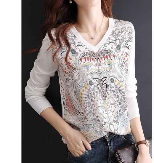 プリントプルオーバー レディース Vネック 長袖 ブラウス シャツ プリント スカーフ柄 花柄 ボタニカル レトロ ニット コットン エスニック きれいめ カジュアル オフィス おしゃれ